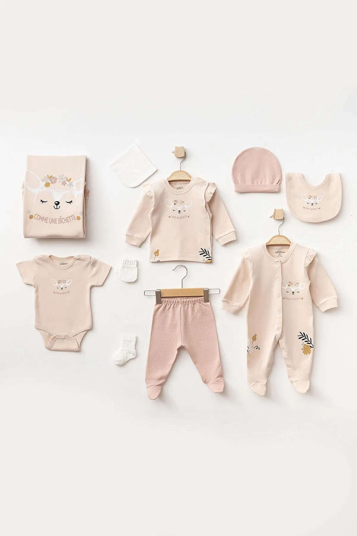 Този комплект от 10 части включва всичко необходимо за специалната и нежна облека на новороденото ви, размерът му позволява да се използва от раждането до тримесечната възраст. Всяка част от комплекта е внимателно изработена от висококачествени материали, гарантиращи мекота и удобство за кожата на бебето ви.