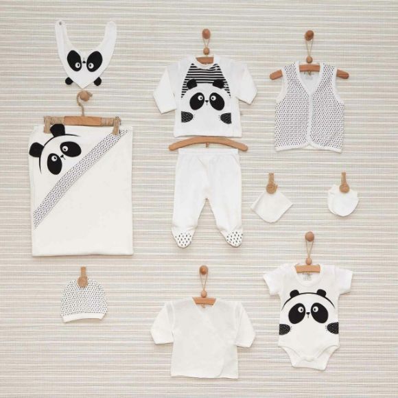 Съдържа: Пелена, жилетка, ританки, елече, боди с дълъг ръкав, камизолка, лигавник, кърпичка, ръкавички, каскетче