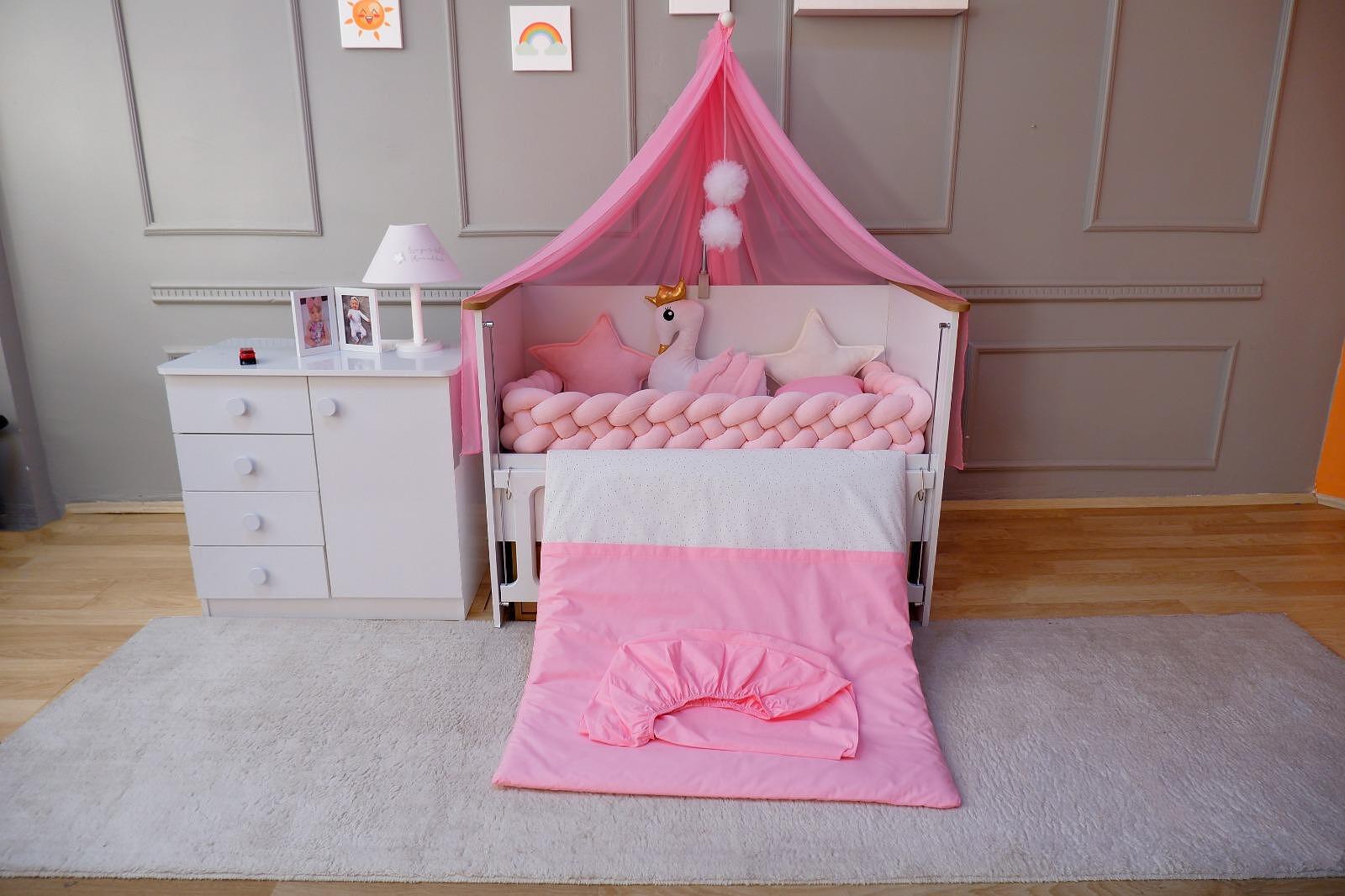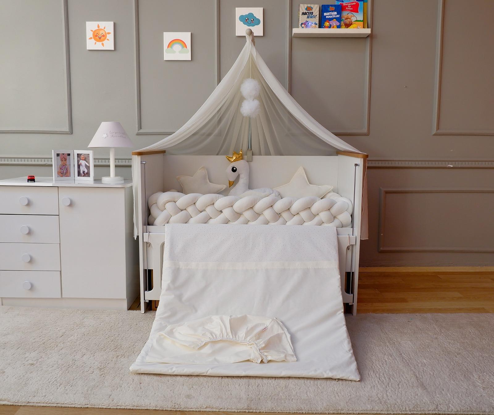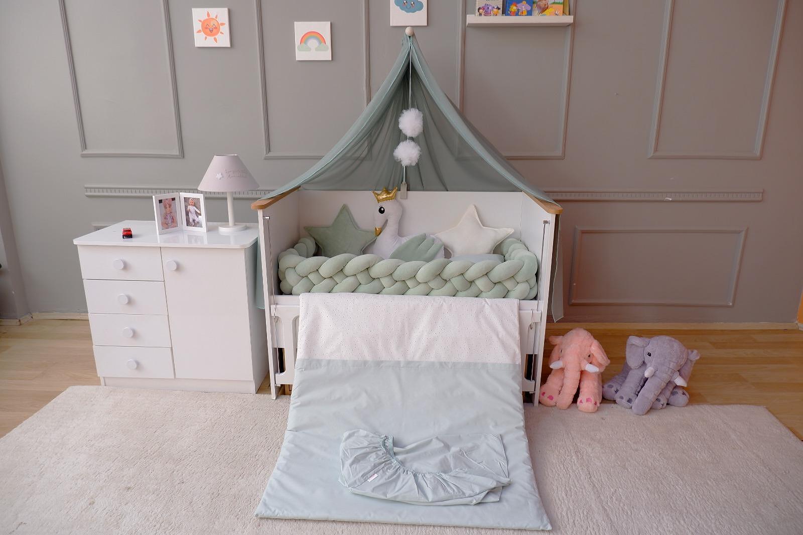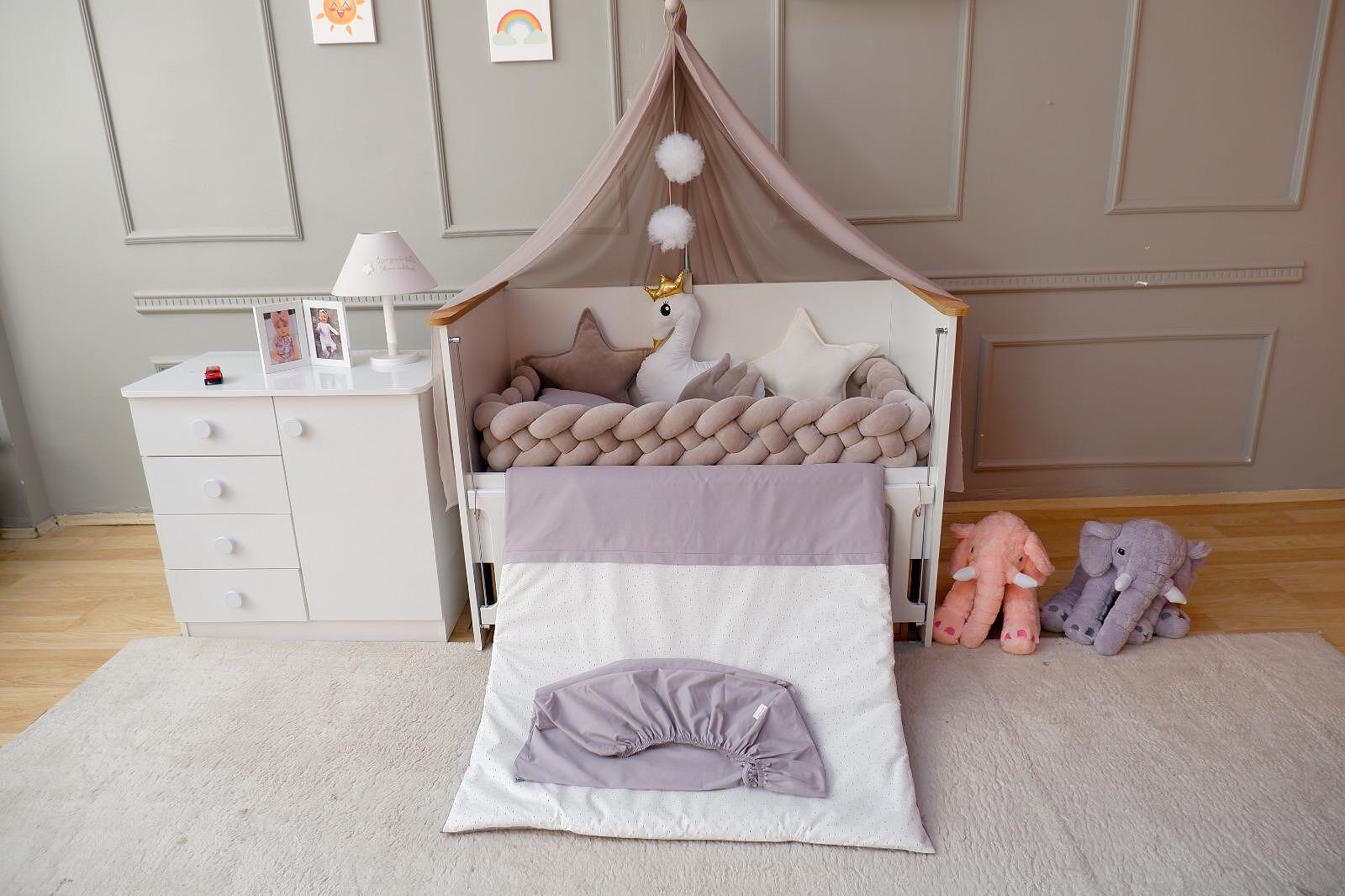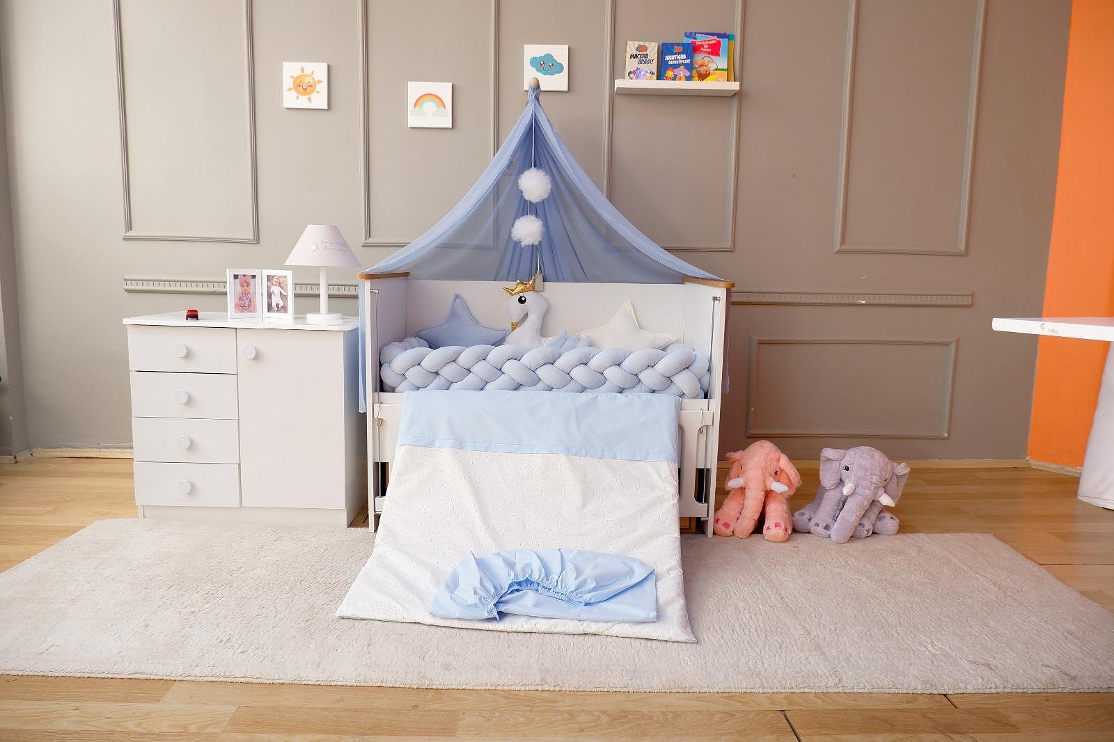 Този комплект за бебешко креватче е в нежен цвят и включва няколко елемента, създадени за удобство и красота в детската стая. Подходящ за легла с размери 60/120