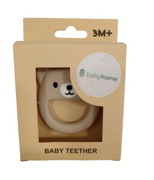 Изображението показва бебешки чесалка с надпис "BABY TEETHER" на опаковката, която е предназначена за бебета на възраст над 3 месеца (3M+).