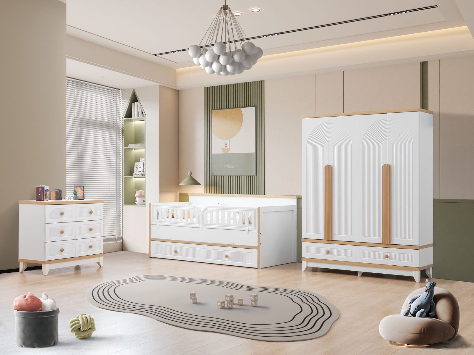Серия Modern Arc впечатлява с изчистен скандинавски дизайн, съчетан с модерни релефни линии и естествени дървесни акценти. Този комплект предлага перфектен баланс между естетика, комфорт и практичност – всичко необходимо, за да се чувства вашето бебе спокойно и защитено от първия ден.