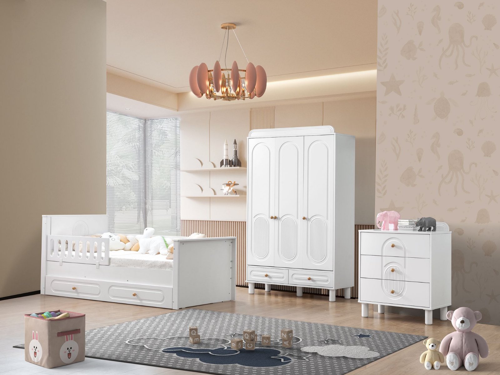 Серия Pure White впечатлява с изчистен скандинавски дизайн, съчетан с модерни релефни линии. Този комплект предлага перфектен баланс между естетика, комфорт и практичност – всичко необходимо, за да се чувства вашето бебе спокойно и защитено от първия ден.